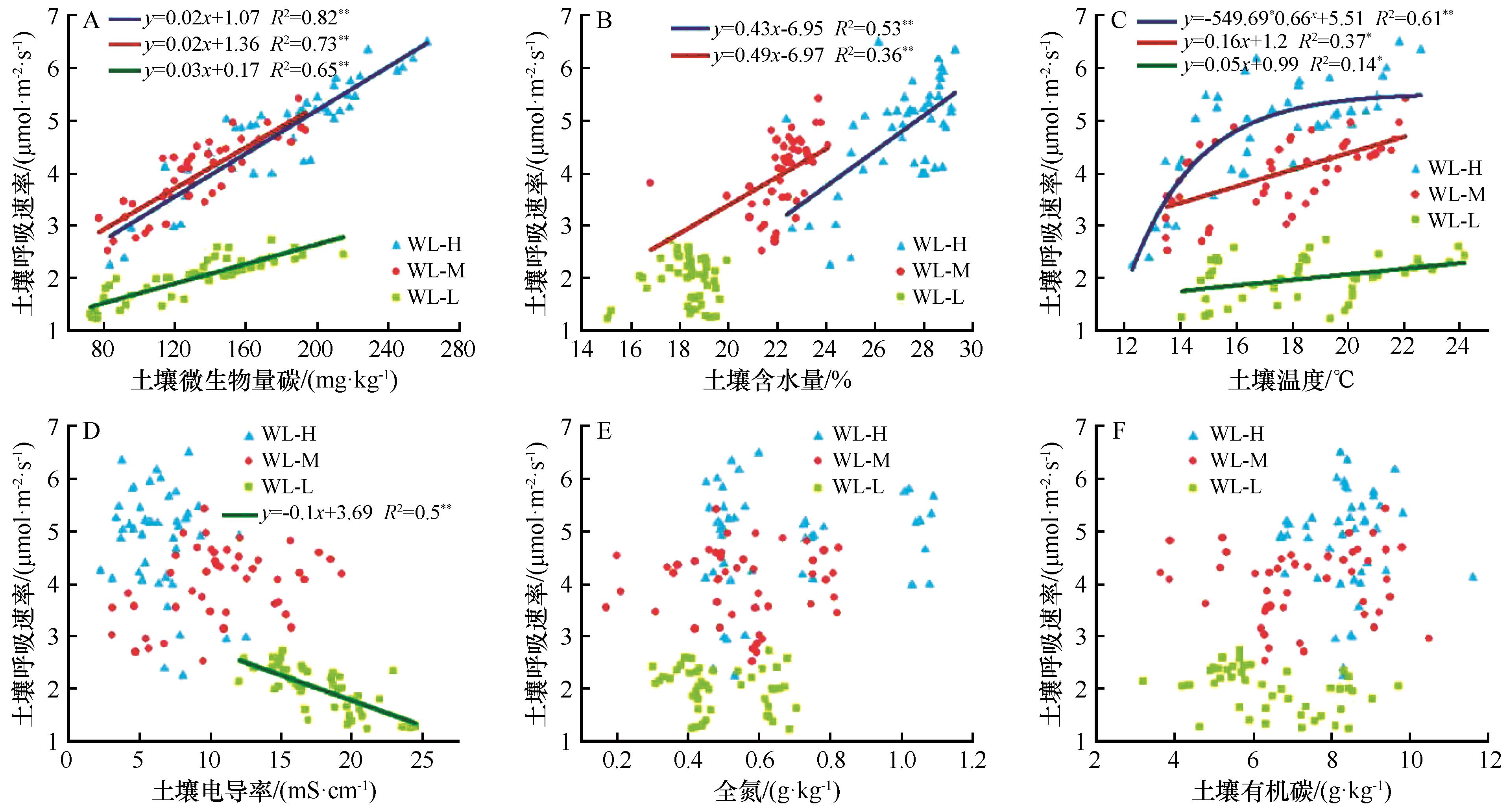 | 图3 不同水位梯度湿地土壤呼吸速率与土壤属性的关系 |