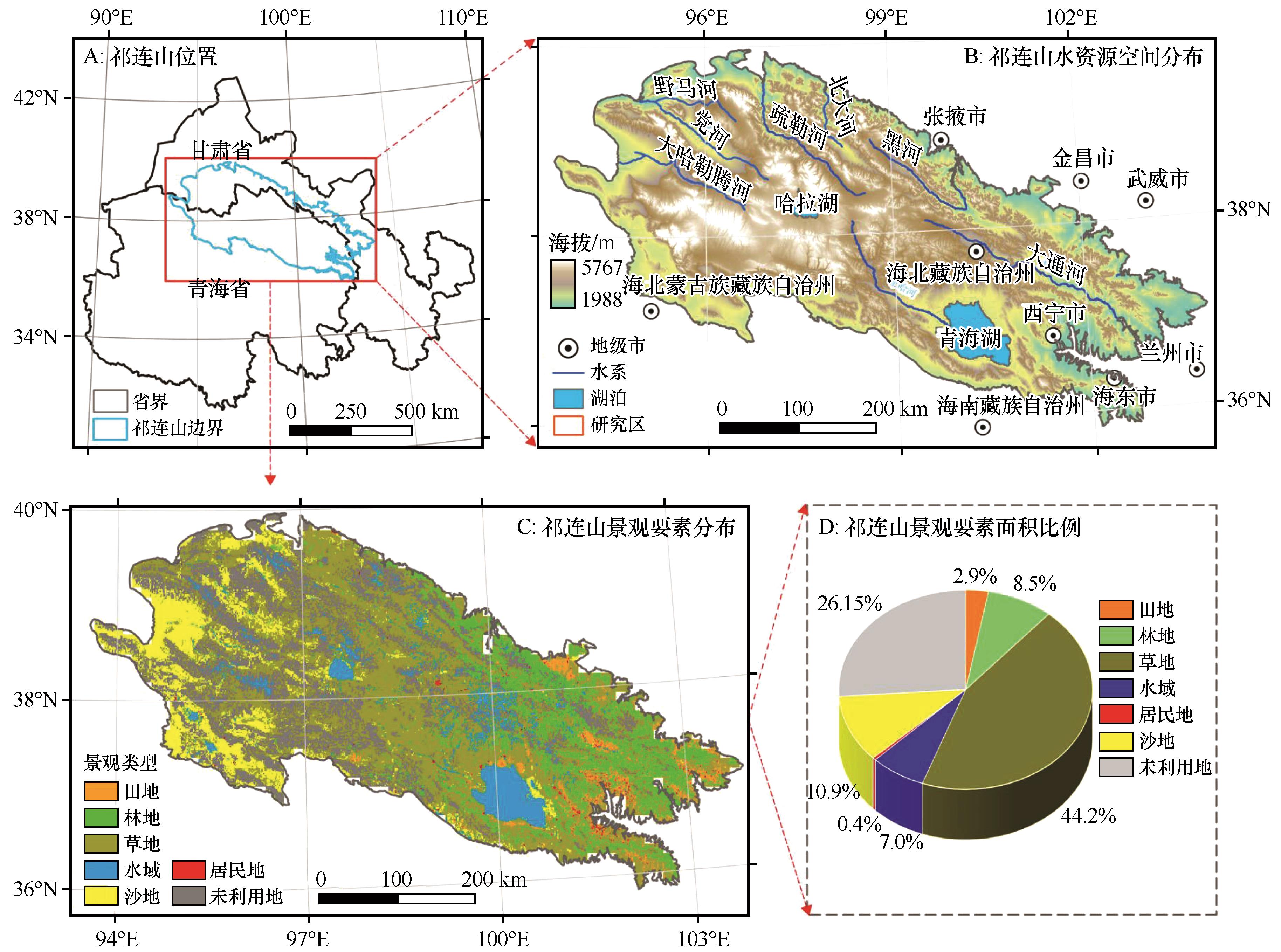Spatiotemporal evolution and driving factors of mountains, water, forest, farmland, lakes, grassland, and desert in the Qilian Mountains,China |