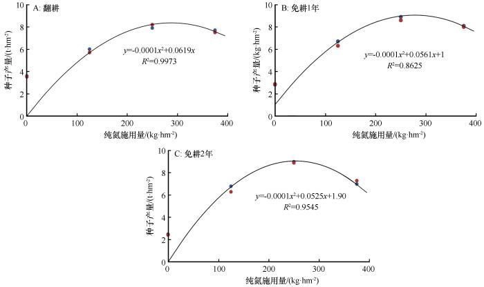 少耕与氮肥配施条件下施氮量与玉米种子产量的拟合曲线