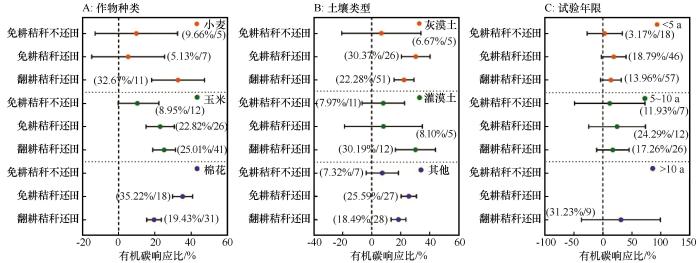 不同作物种类、土壤类型及试验年限下耕作方式对土壤有机碳的影响