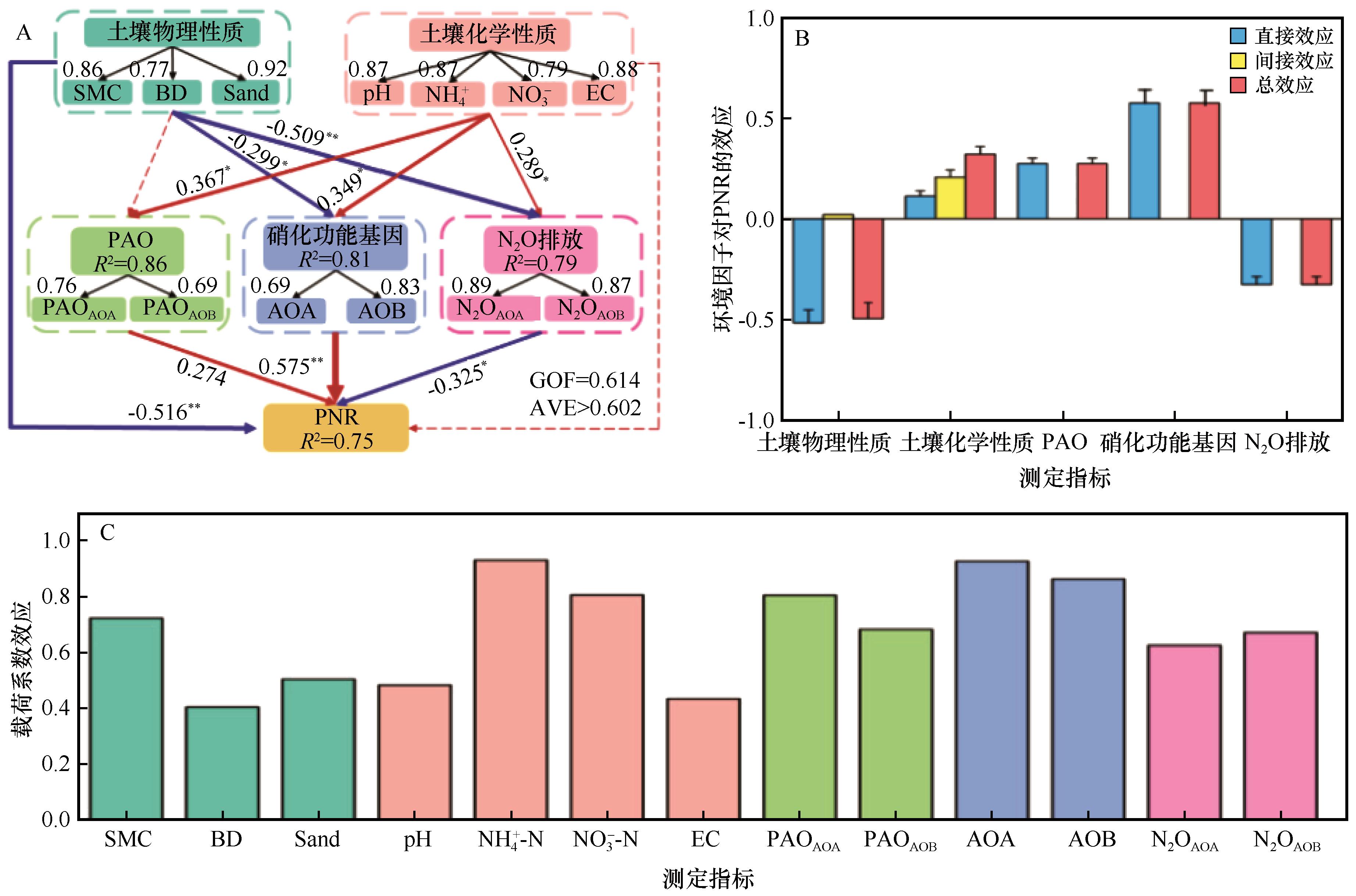 | Fig.5 PLS-PM of PNR and environmental factors (A), standardized total effects (B), and loadings coefficients (C) |