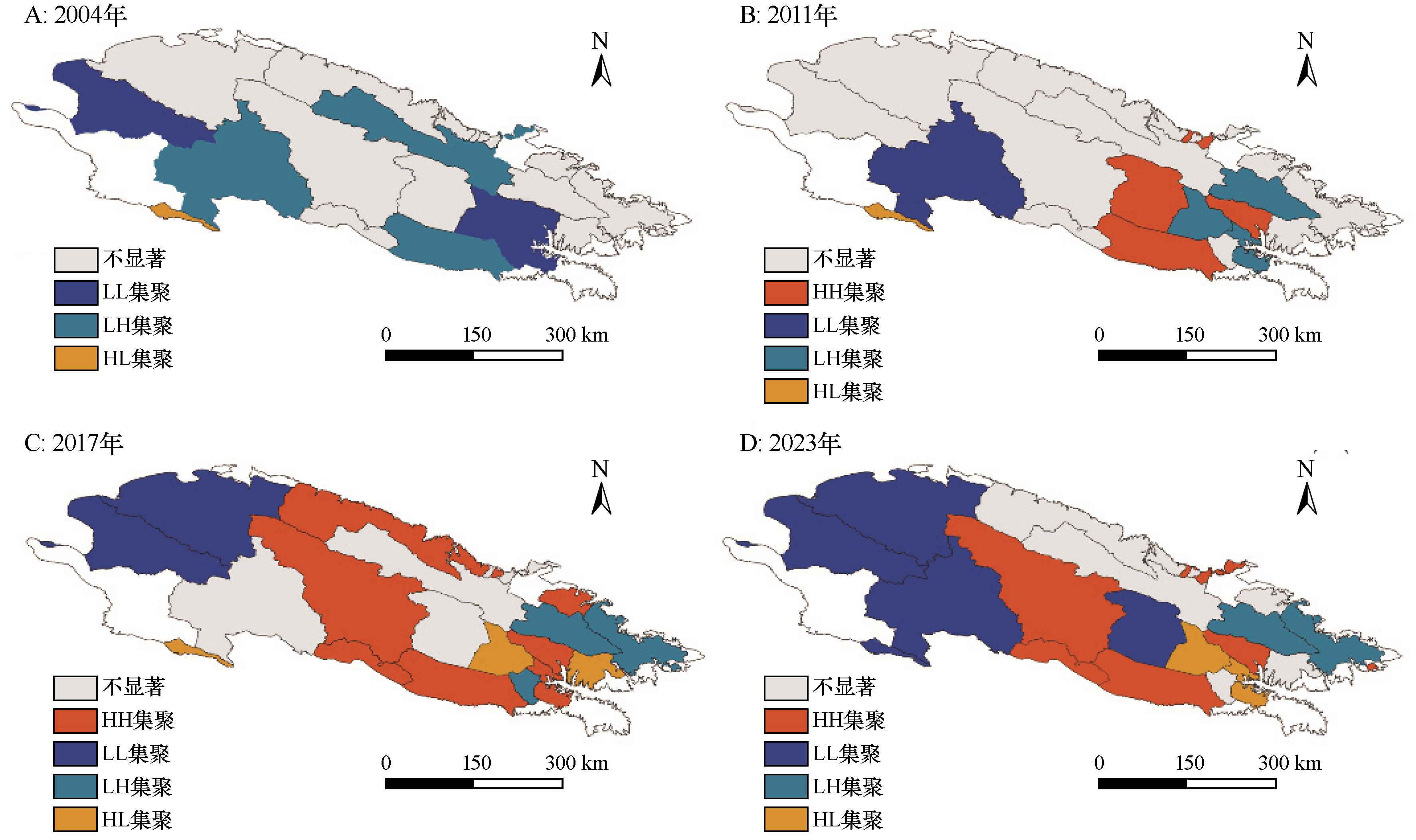 | Fig.4 Local spatial autocorrelation spatial distribution of ecological efficiency in animal husbandry in Qilian Mountains in 2004-2023 |