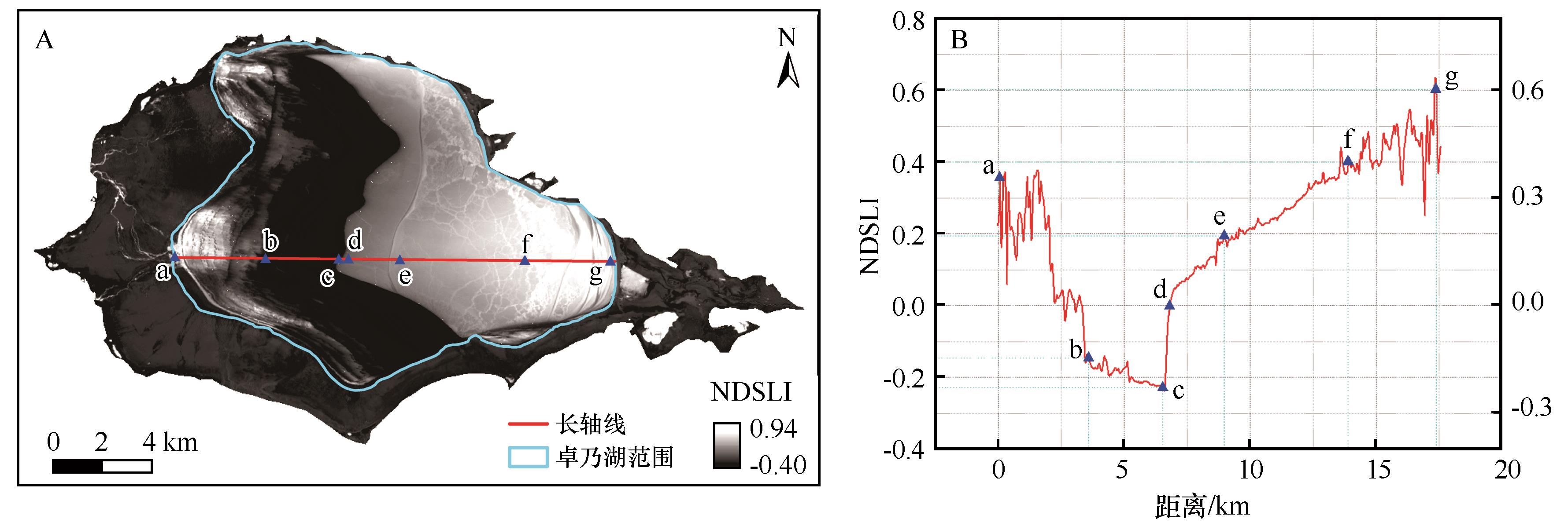 | Fig.5 Profile of NDSLI values (B) along the vector line on the lake (A) |