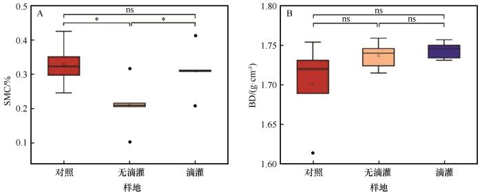 ... 所有实验数据均基于土壤干重计算,实验结果以算术平均值±标准误(n=5)的形式表示.数据采用SPSS 27.0软件进行统计,针对对照区、无滴灌区以及滴灌区土壤物理、化学、生物学属性的组间差异,采用独立样本t检验进行区分.土壤酶活性与理化性质两个矩阵间的关系用Mantel检验分析,土壤理化指标间及其与土壤酶活性的关系用Pearson相关性分析实现,上述结果可视化采用linkET R语言包实现[23].土壤物理、化学以及生物学属性图采用Origin 2024软件绘制完成. ...