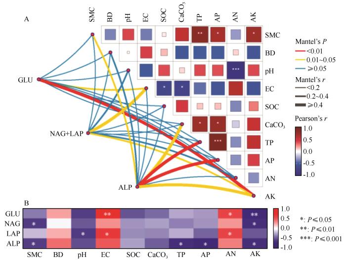 ... 土壤理化指标的测定,参照鲍士旦[22]的方法进行.土壤容重(BD)采用体积为100 cm3的环刀测量,土壤含水量(SMC)根据烘干后土壤质量与鲜土质量的差值计算.土壤pH和电导率(EC)分别使用pH计和EC计测定.土壤有机碳含量(SOC)采用K2Cr2O7氧化法测定,碳酸钙(CaCO3)含量采用酸碱滴定法测定.土壤碱解氮(AN)采用碱解扩散法测定,有效磷含量(AP)采用碳酸氢钠浸提-钼锑抗比色法测定,速效钾含量(AK)采用乙酸铵浸提-火焰光度法测定.土壤总磷量(TP)采用酸溶-钼锑抗比色法测定.土壤中与C、N、P循环相关的β-葡萄糖苷酶(GLU)、N-乙酰-β-D-氨基葡萄糖苷酶(NAG)、亮氨酸氨基肽酶(LAP)以及碱性磷酸酶(ALP)的活性采用苏州梦犀生物医药科技有限公司的试剂盒进行测定. ...