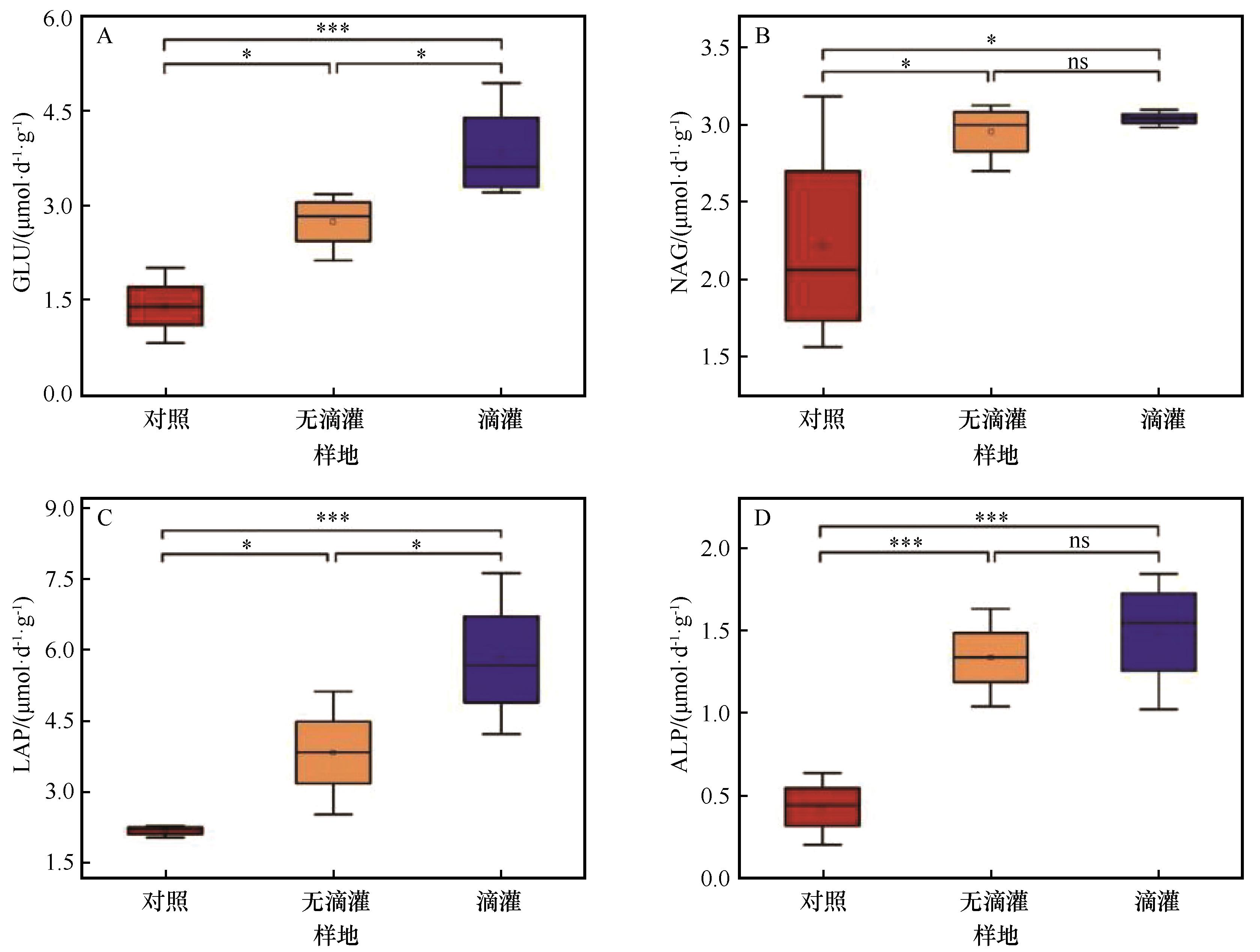 GLU为β-葡萄糖苷酶;NAG为N-乙酰-β-D-氨基葡萄糖苷酶;LAP为亮氨酸基肽酶;ALP为碱性磷酸酶。*为