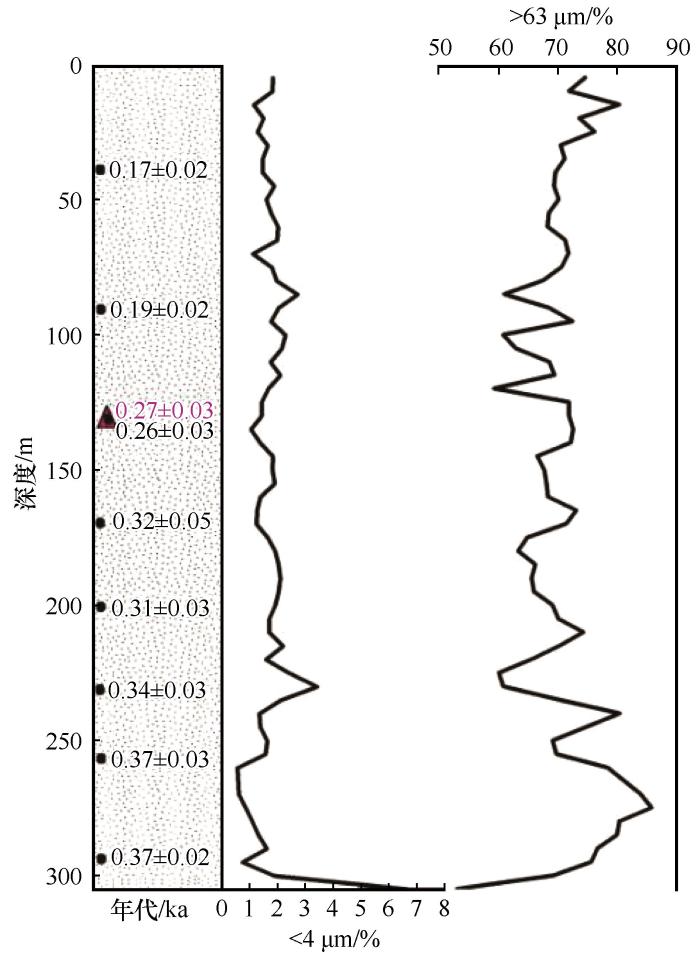 剖面OSL、AMS14C样品年代分布图及粒度随深度变化