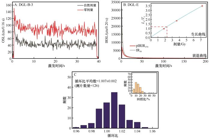 DGL-B-3石英样品测片信号衰减曲线(A);DGL-E钾长石样品测片信号衰减曲线及剂量响应曲线(B);钾长石测片循环比与回授比直方图(C)