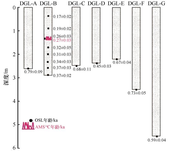 本研究的主要采样剖面DGL-B位于昆仑山北麓洪积扇扇中位置,发育在干涸的辫状河道河漫滩上,周围类似灌丛沙堆广泛发育,DGL-B剖面底部海拔为2 877 m。整个灌丛沙堆高约3 m,灌丛沙堆仍在持续堆积阶段,上覆有生长中的柽柳,盖度约70%,在沙堆中部伴有死亡柽柳树枝及根系,该剖面的AMS14C样品即是在其间获取的植物细枝残体。其余6个柽柳灌丛沙堆采集底部OSL样品,底部采样的目的是获取沙堆的起始年代,在采样过程中以挖到明显洪水沉积层为标准。