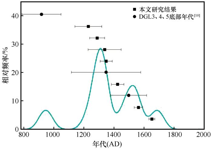 AMS14C测定由广州碳年科技有限公司完成,样品经酸洗去除碳酸盐,使用OxCal v4.4.4.程序,使用IntCal 20校准曲线进行校正[18]。AMS14C测定年龄均校准为相对于1950年的历年。在本研究中,为便于比较,OSL年龄和校准后的放射性碳年龄在本文中统一转换为相对于采样时间2022年的年龄。