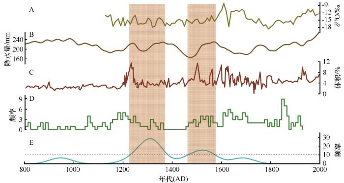 柽柳灌丛沙堆的形成演化过程本质上受其发育环境条件的综合调控,柽柳灌丛作为典型的耐盐碱植物,对地下水位有较强的依赖性,灌丛沙堆在地表水消失后开始发育,沉积物遇灌丛阻滞不断堆积,当植被覆盖度达到一定程度,灌丛沙堆沉积物以堆积为主,其沉积速率随风沙活动、物源供应等不断变化[26-28]。因此,将大格勒柽柳灌丛沙堆大量形成阶段与重建的苏干湖风沙活动及中国历史记录中的沙尘暴活动相对照,时间大致一致[29-30](图8),表明区域沙尘暴活动为灌丛沙堆的形成提供了主要的动力来源。18、19世纪的沙尘暴活动时期未见灌丛沙堆形成,这可能是由于前人与本研究的采样对象均集中于较高大的、成熟期和老年期灌丛沙堆,年代集中对应于早期尘暴阶段,而对相对低矮的幼年期的灌丛沙堆的关注度不够,后续研究将加强更多早期阶段灌丛沙堆年代进行佐证。