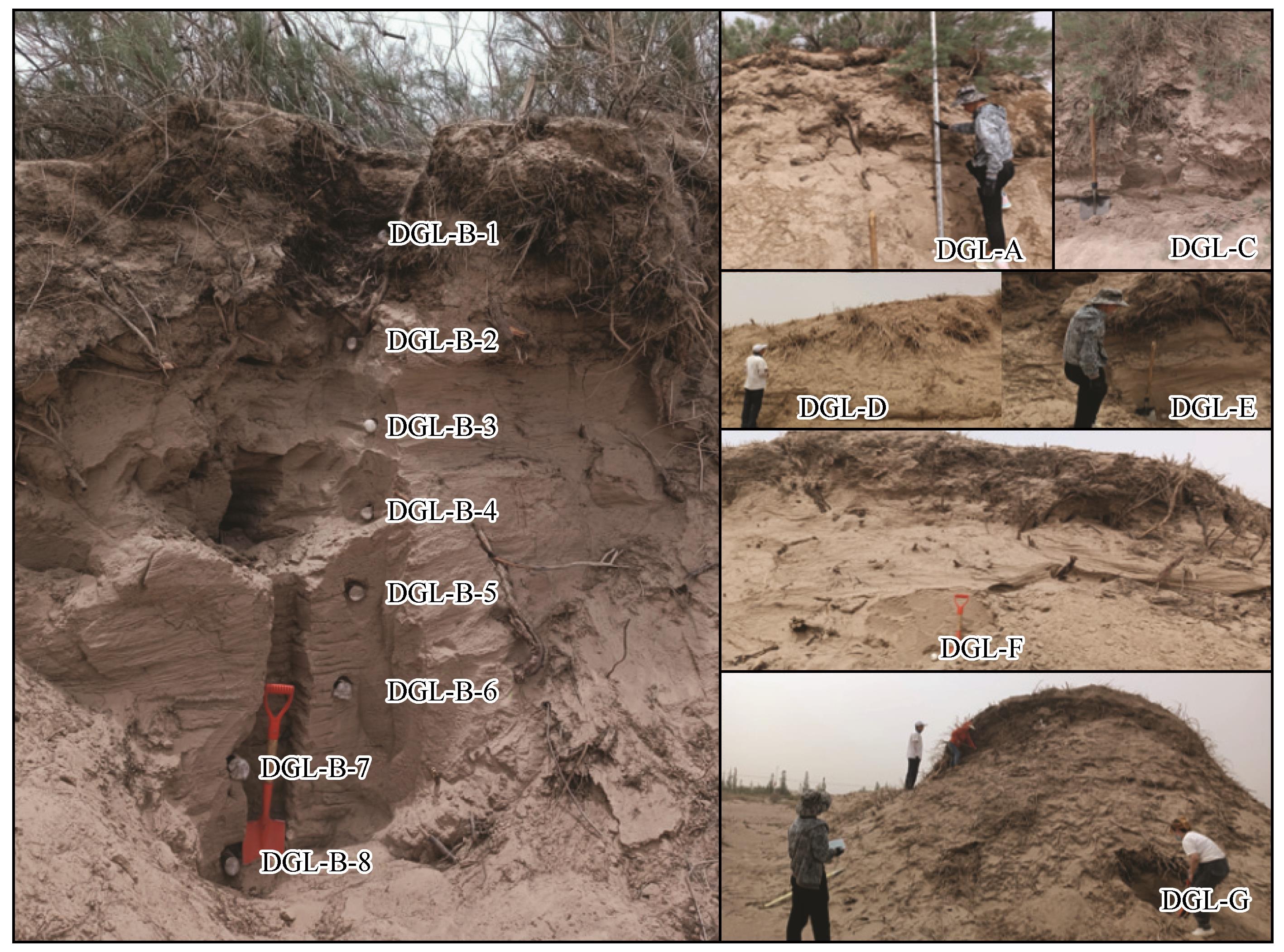 | Fig.2 Photos of Tamarix chinensis nebkha profiles and location of profile OSL sample collection (where DGL-B on the left is the main sampling profile) |