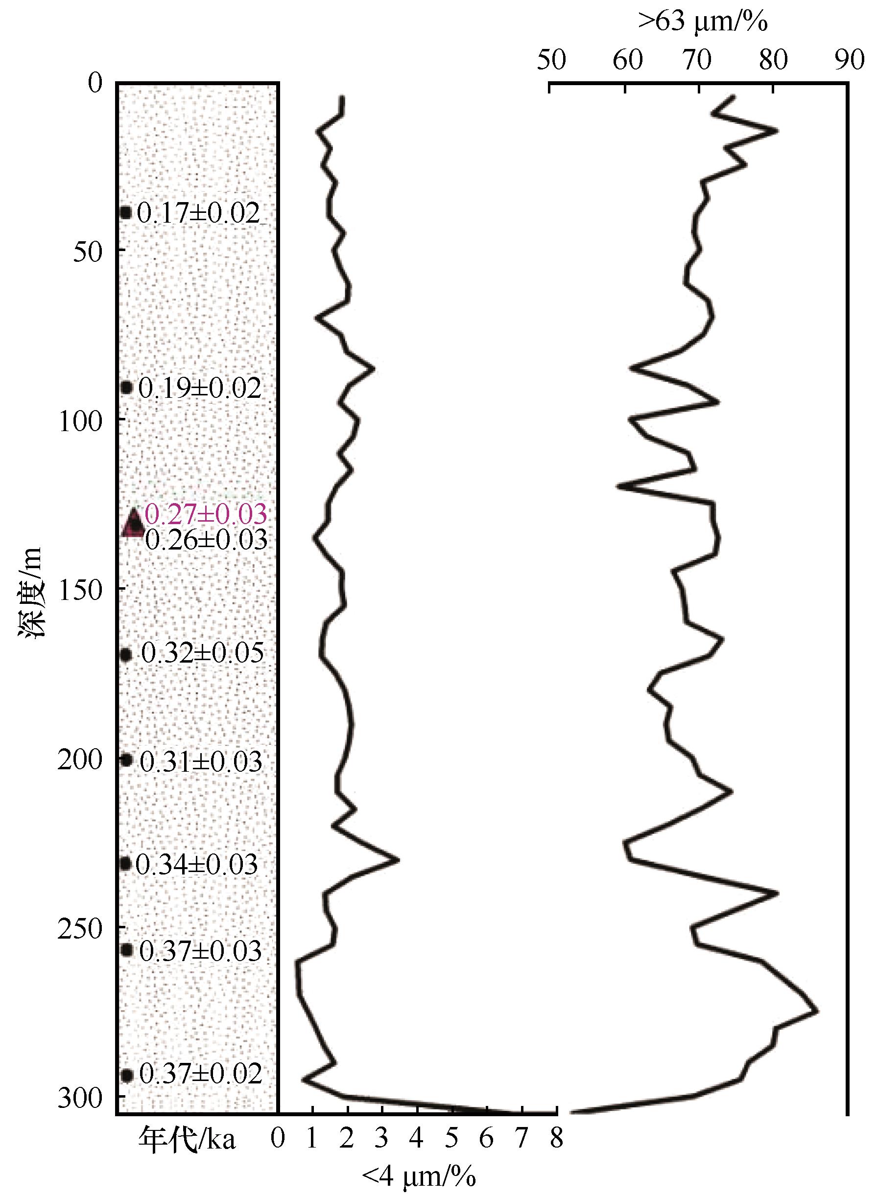 | 图4 剖面OSL、AMS14C样品年代分布图及粒度随深度变化 |