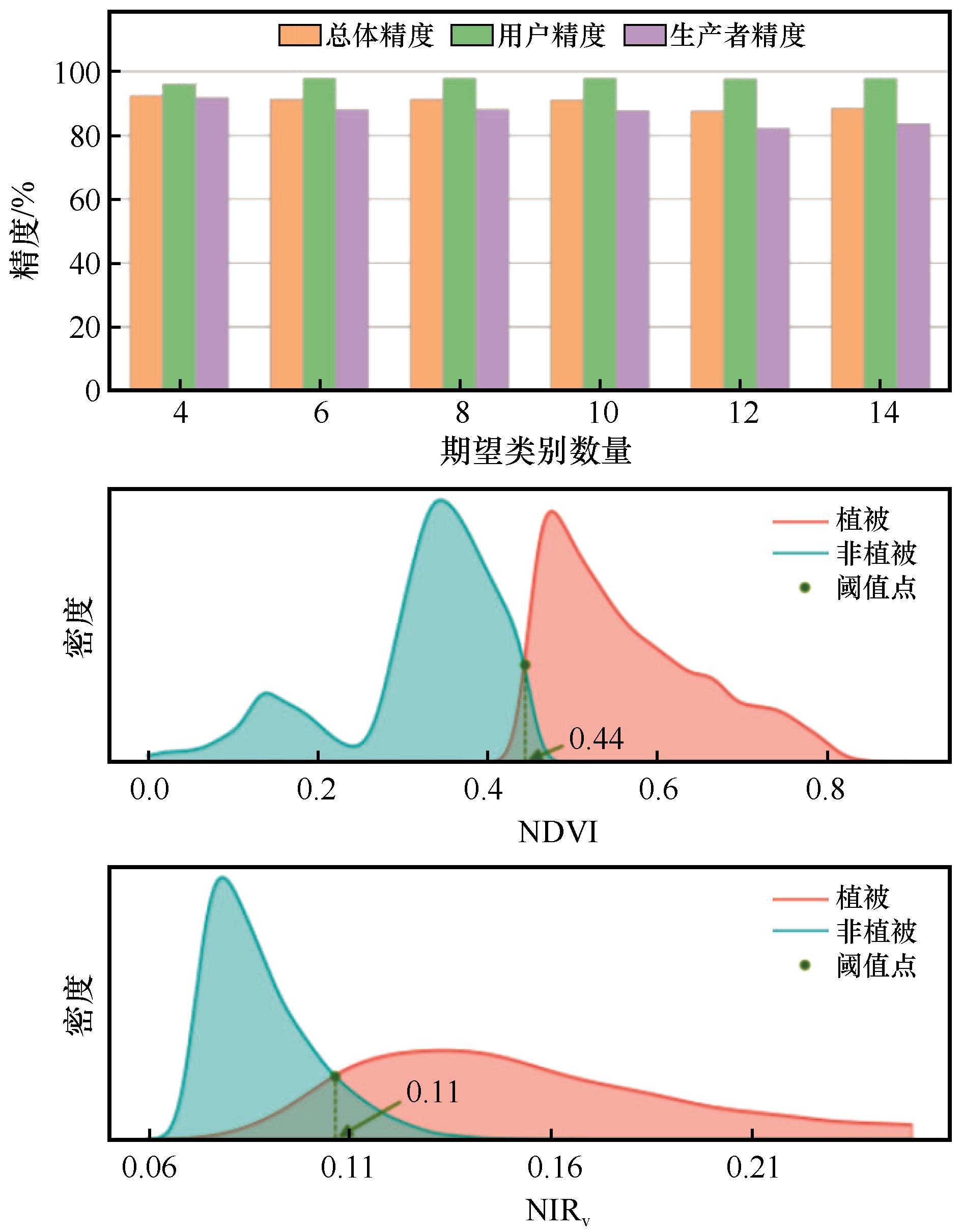 | 图4 提取植被过程中各期望类别数量结果精度统计及阈值分割 |