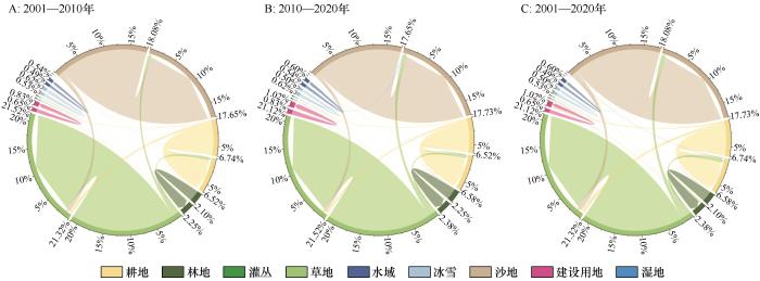 2001—2020年中国北方干旱半干旱区土地利用转移弦图