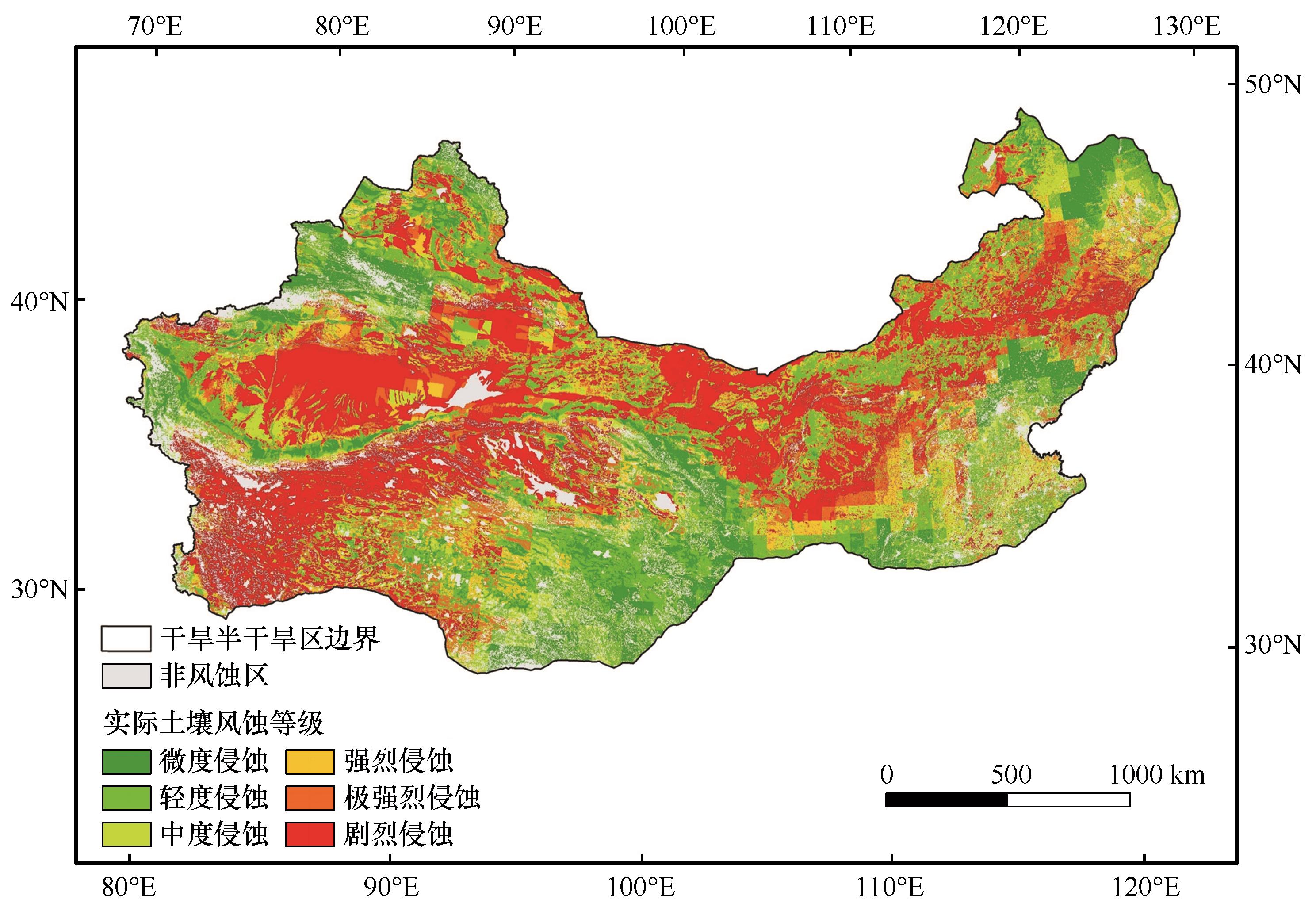 | 图2 2001—2020年中国北方干旱半干旱区多年平均实际风蚀等级空间分布 |