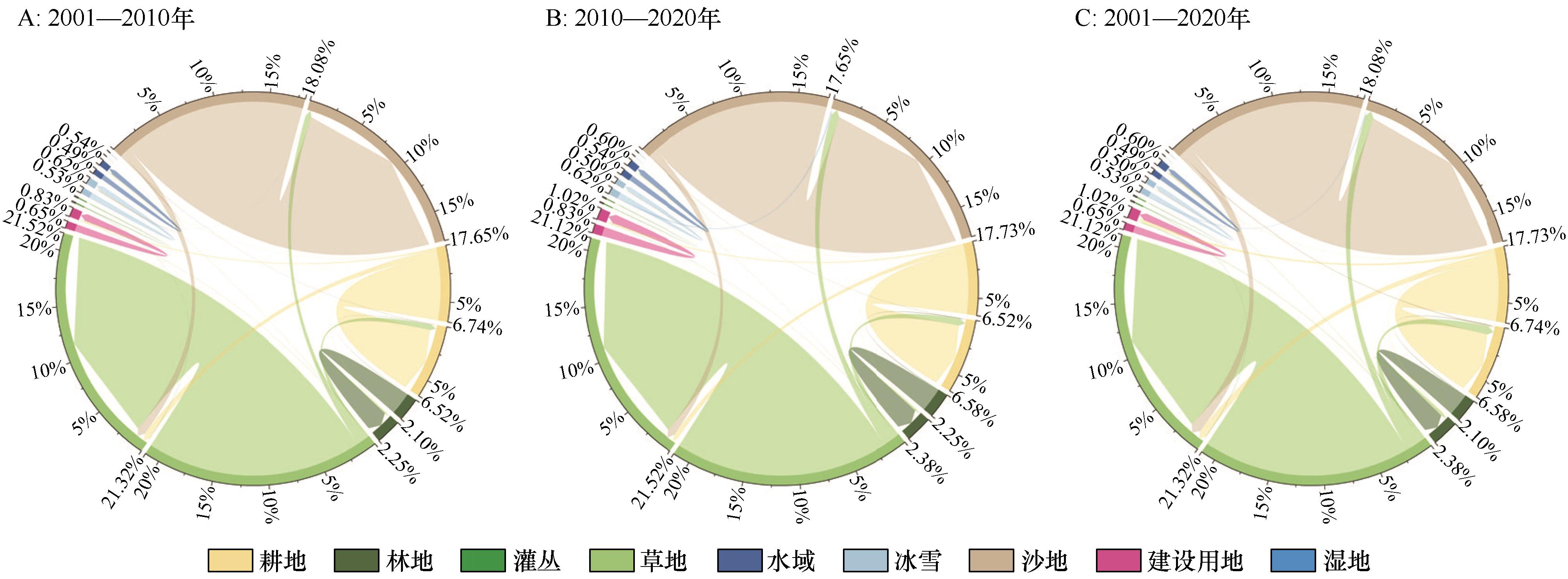 | 图4 2001—2020年中国北方干旱半干旱区土地利用转移弦图 |