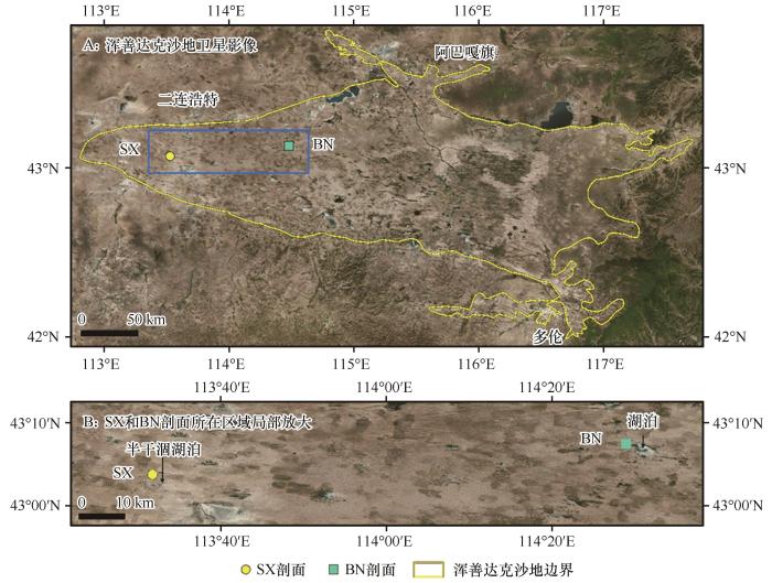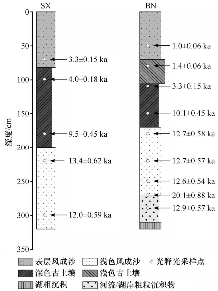 ... 地层沉积物采集自浑善达克沙地赛罕锡林剖面(SX)及其以东的巴彦诺尔剖面(BN),后者所在区域较前者湿润,且两者附近有干涸、半干涸湖泊分布(图1).SX和BN剖面采样深度均为300 cm,采样间隔为10 cm.Yang等[19]对两个剖面的研究发现,两者整体形成于晚更新世末期,沉积地层底部年龄约为13 ka(图2).其中,SX剖面第一层为浅黄色的表层风成沙,第二层为富含有机质的深色古土壤层,第三层为浅白色的浅色风成沙;BN剖面与SX剖面类似,但沉积更复杂,其最上部仍为浅黄色的表层风成沙,第二层为浅色古土壤,属于从古土壤向风成沙的过渡类型,第三层为深色古土壤,第四层与SX剖面第三层类似,为浅白色的浅色风成沙,第五层为风选较差的河流/湖岸粗粒沉积物,第六层为胶结较好的、由粉砂和黏土组成的湖相沉积(本文未对该地层分析). ...