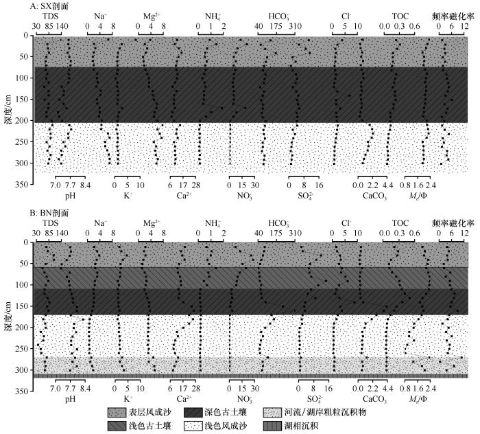 ... 浓度较低的情况下,样品的pH与Eh线性相关,EC与TDS线性相关[26].SX和BN剖面易溶盐浸提液的TDS较低,绝大多数<100 mg·L-1,上述参数的相关性较好,在SX剖面中,pH与Eh、EC与TDS的R2分别为0.995和0.999,在BN剖面中R2则分别为0.996和0.999,故本文只选择TDS和pH作为指标以简化分析过程.对比表层风成沙、古土壤、浅色风成沙易溶盐浸提液的TDS发现(表1),其在SX剖面的均值均高于BN剖面对应地层(对于BN剖面而言,浅色古土壤和深色古土壤差异不大,此处作为一层处理);对比pH发现(表1),其均值在SX剖面表层风成沙中高于BN剖面,但在古土壤和浅色风成沙中均低于BN剖面,但整体而言,SX和BN剖面易溶盐浸提液的pH较低,普遍小于8,呈中性—微碱性. ...