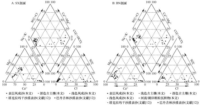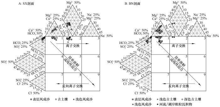... 除淋溶淀积作用外,引起SX和BN剖面易溶盐在垂直方向上发生变化的原因还包括离子交换和溶解/线性混合.土壤中的黏土矿物、有机质和氢氧化物等固相可作为吸附剂,与液相接触时发生离子交换,该过程属于可逆的等当量交换反应[36].在SX剖面上、中层,随着深度的增加,Ca2+含量减少而Na+ + K+(水化学分析中通常将Na+ 和K+合并处理)和Mg2+含量增加(图3A),扩展型Durov三线图(图6A)显示产生该现象的原因是离子交换.由图3A可知,这个过程中CaCO3的减少并不明显,但沉积物易溶盐中的Ca2+显著减少,从占阳离子总量最高超75%减小到不足50%(图4A).这是由于对特定的固相物质而言,Ca2+的吸附亲合力大于Mg2+、K+、Na+[37],通过阳离子交换,沉积物原来吸附的Na+ + K+和Mg2+被解吸释放,而Ca2+则被吸附在沉积物上,从而减缓了CaCO3的溶解速度.因此在SX剖面中,Na+ + K+和Mg2+应具有相似的变化趋势,但由于K+在SX剖面10 cm以下近似为0,实际情况则是Na+和Mg2+具有相似的变化趋势(图3A).此外,扩展型Durov三线图(图6B)显示,BN剖面从底层至表层属于简单溶解/线性混合过程,并伴随着Na+ + K+的明显增加(图4B).这种Na+ 、K+向表层集聚的现象一般是盐碱化引起的,BN剖面的这种易溶盐分布特征可能和底层易溶盐的上升有关.引起盐碱化的主要原因包括干旱少雨、蒸发强烈、地形低洼、坡度平缓、湿地浸渍和灌排不协调等[38].BN剖面底部有明显的湖相沉积物,这些湖相沉积可能来自于全新世中期曾出现的古大湖[30].该剖面相对周边地形较低,目前周围仍残存多个大小不等的盐湖,地下水位较浅,这些条件为易溶盐随毛管上升水向表层移动和聚积提供了有利条件. ...