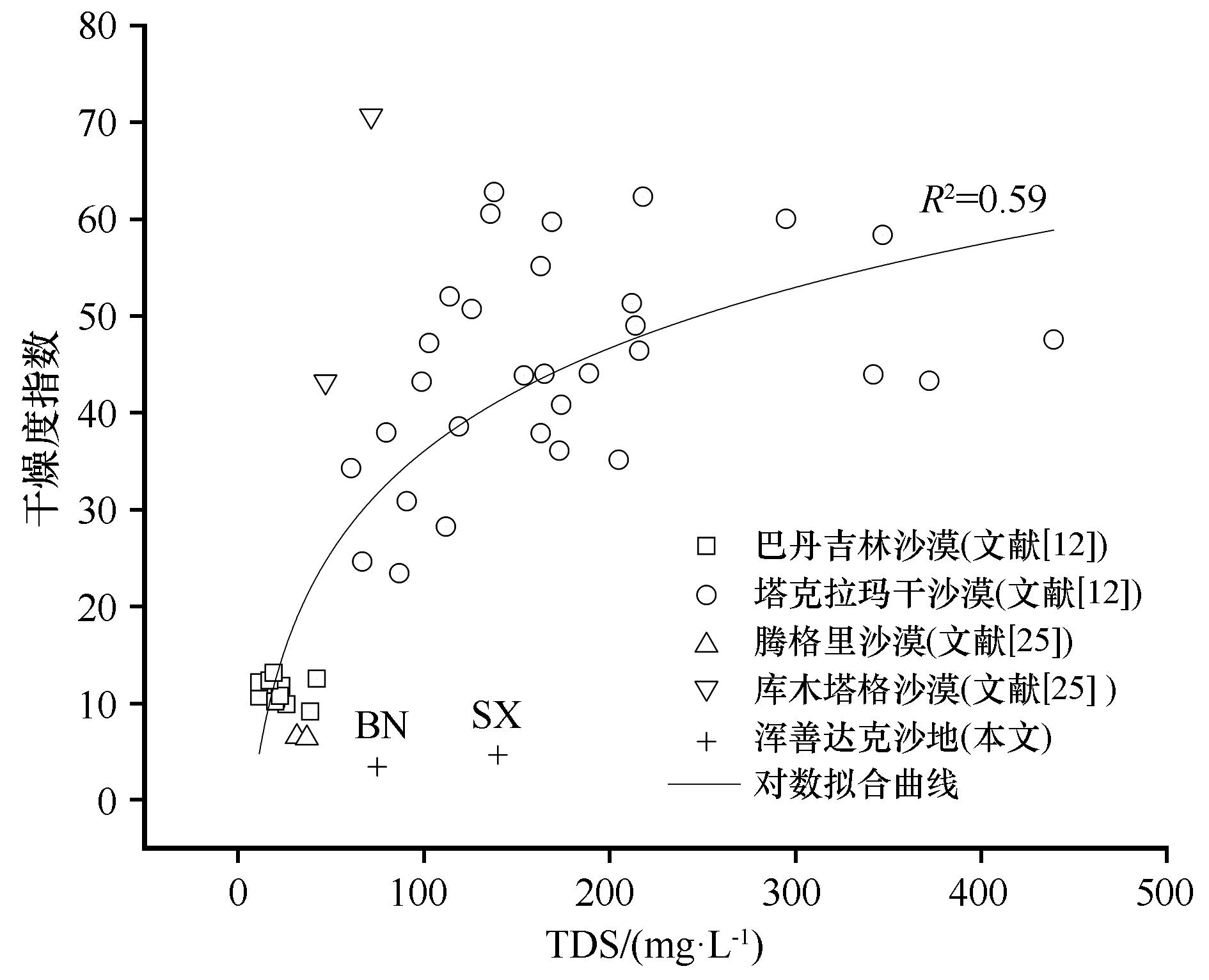 | 图5 干燥度指数与沙漠表层沉积物易溶盐TDS关系 |