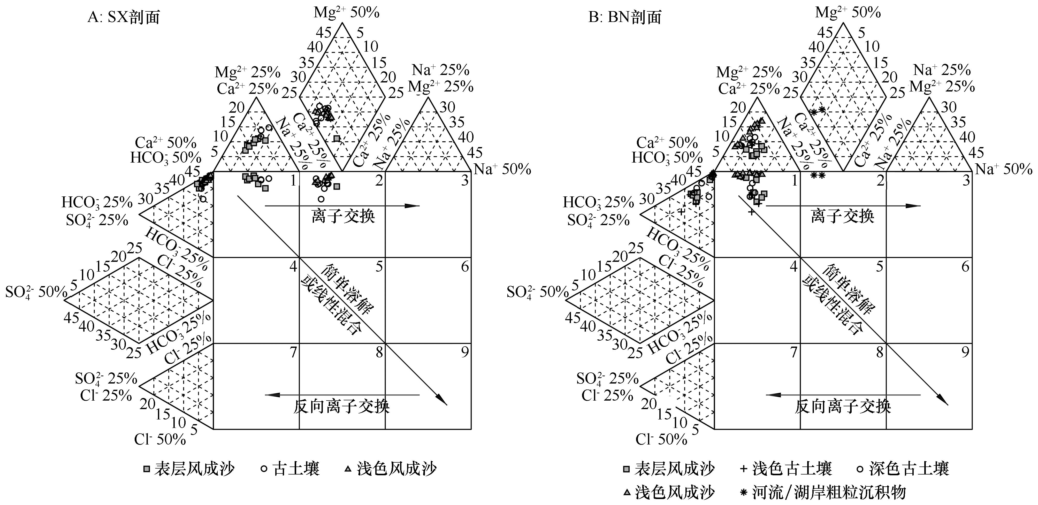 | 图6 扩展型Durov三线图指示的SX和BN剖面易溶盐水文地球化学演变过程 |