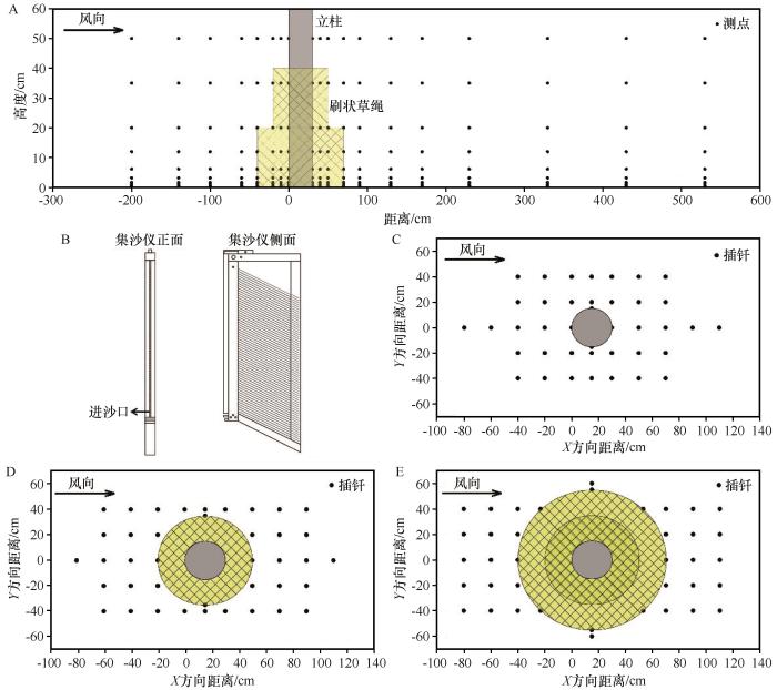 试验风速基于研究区风速状况,应对未来气候不确定性,参考风洞试验风速设计[18 -19 ] ,选择从起沙风速(6 m·s-1 )开始,依次增加4 m·s-1 ,得到6、10、14、18 m·s-1 等4种试验风速。分别选取4组试验风速,使用皮托管对不同高度和水平位置的流场特征进行测定。皮托管设置在风洞横截面中央,在垂直方向设定与风洞底面相距的10个测量高度(z ),分别为0.3、0.6、1.1、1.6、3.1、6.1、12.0、20.0、35.0、50.0 cm。试验过程中,通过移动皮托管改变流场水平测点,立柱周围测点共19个(图3 A),即-200、-140、-100、-60、-40、-20、-10、0、30、40、50、70、90、130、170、230、330、430、530 cm,测点与立柱前缘的距离用x 表示,负值为立柱前缘上风向的测点,正值为立柱前缘下风向的测点。对于每个风速测量点,风力数据采集的持续时间为30 s,风速记录频率为1 s,每次记录时间为20 s。