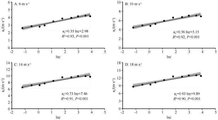 式中:uz 是高度z cm处的风速(m·s-1 );z 是高度(cm);a 和b 是回归系数。拟合优度R 2 均大于0.90,所有回归关系均具有统计学意义(P <0.001)。