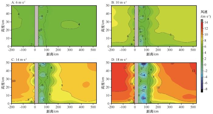 立柱周围存在大范围减速区,靠近地表(z 取值0~5 cm)减速区范围最大(x 取值-200~530 cm),远离地表(z 为5~50 cm)减速区范围x 为-50~200 cm。在立柱前缘底部(z 为0~5 cm)出现加速区,而立柱后方气流方向发生反转,形成顺向涡流(x 为30~100 cm)。随着风速增加,立柱后方气流削减效果变强,减速区域几乎不变(图5 )。