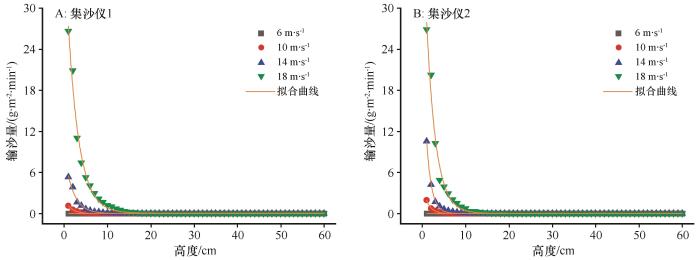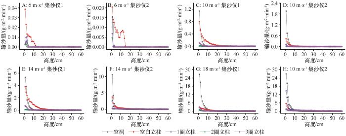 将空白立柱及3种防掏蚀模式布置于10 cm厚的积沙表面,每组试验前,均补充沙样,并用工具刮平,以保证沙床的厚度、长度、表面形态一致。利用直立式集沙仪(图3 B)收集0~60 cm 高度的输沙量,集沙仪有60个集沙口,分别长1 cm,宽0.5 cm。在立柱后缘下风向1 m处(集沙仪1)和2 m处(集沙仪2)摆放。设置6、10、14、18 m·s-1 等4组试验风速,分别吹蚀10、4、2、1 min。同时以空洞条件为对照,吹蚀条件与设置沙障时相同。每次吹蚀完成后,用天平(1/1000)称取每个高度层收集的沙重。