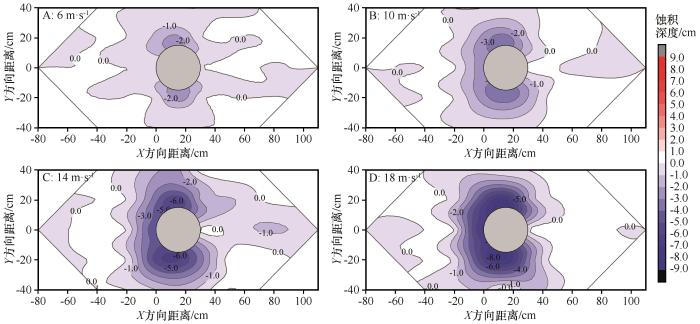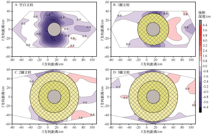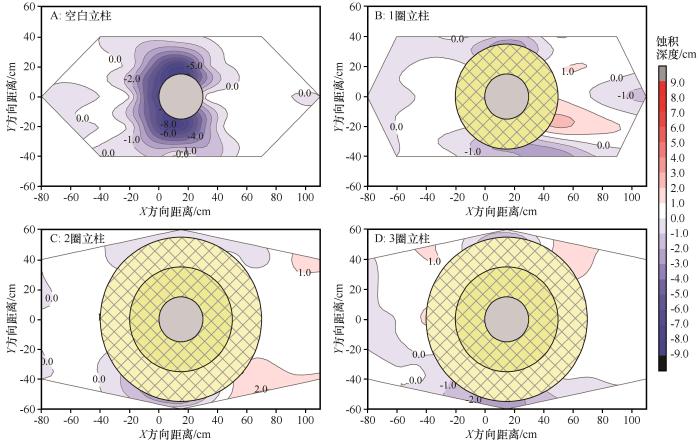 运用插钎法对空白立柱及防掏蚀模式的蚀积情况进行监测。空白立柱共布设40根插钎(图3 C),1 圈立柱共布设40根插钎(图3 D),2 圈立柱和3圈立柱分别共布设38根插钎(图3 E)。设置6、10、14、18 m·s-1 等4组试验风速,分别吹蚀10、4、2、1 min,每次吹蚀结束后,根据插钎刻度线确定蚀积深度。