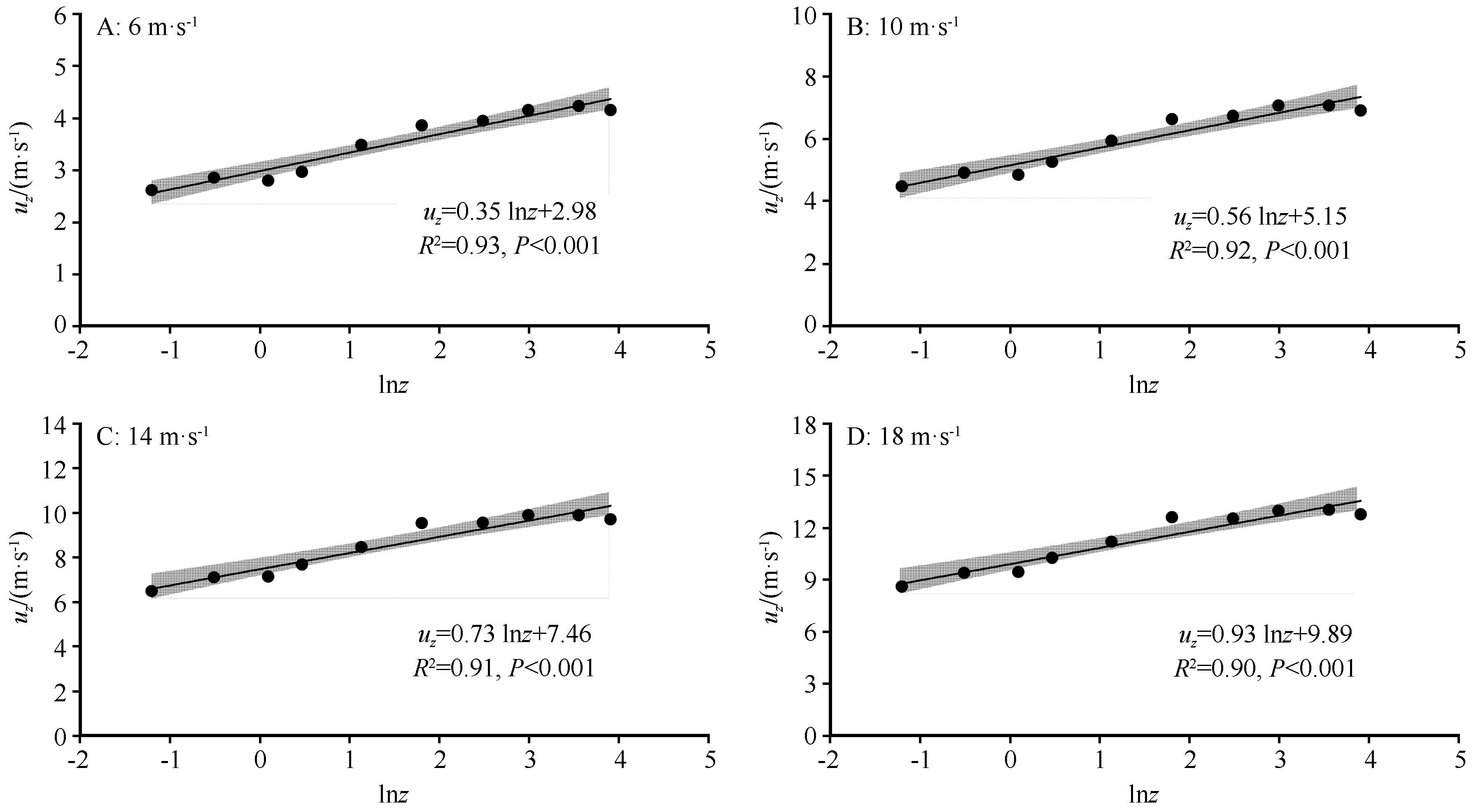 | 图4 不同风速下空洞风速廓线(95%置信区间) |