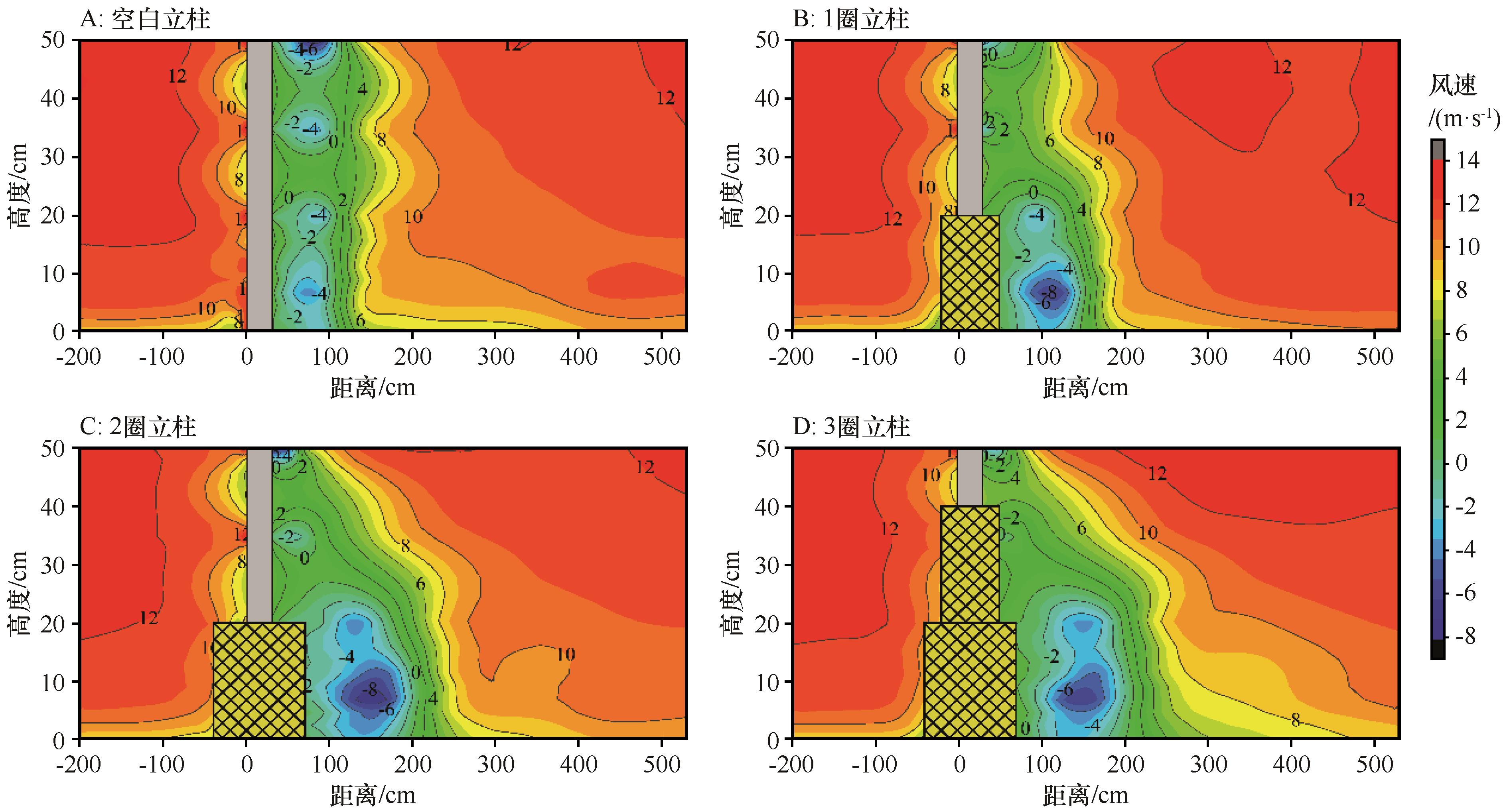 | 图6 18 m·s-1风速下不同立柱模式流场 |