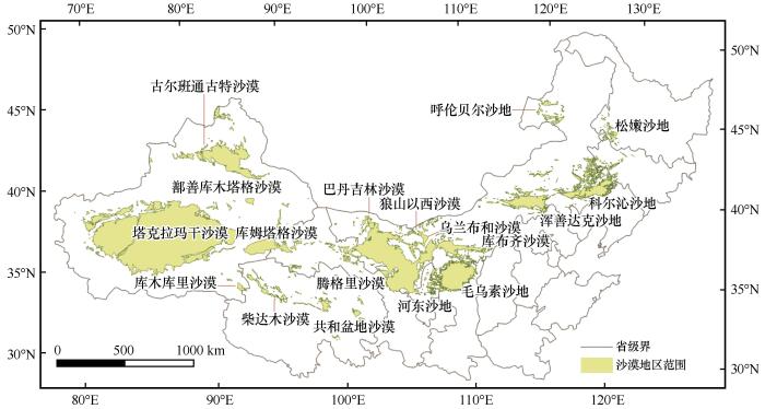 ... 沙漠地区范围的界定方法包括自然区划、生态区域、行政区划、水系流域分割、第四纪地质、地貌成因类型等[30].以往学者多根据自己研究需求来确定沙漠地区范围,使得大量研究成果较难在同一标准下进行对比与分析[31-32].现代沙漠的形成、发育及其物质来源和第四纪时期古地理有密切联系,因此,以其下伏地貌的成因类型作为分区的标准具有合理性[33].这是因为下伏地貌成因类型实质上反映了风沙地貌形成的第四纪古地貌基础,它对覆盖其上的沙丘形成发育有着重要的影响;同时,下伏地貌的成因类型也反映了风沙物质的沉积条件,从而为沙丘沙的物质来源提供线索[34].因此,本文采用地貌成因原则精细界定了沙漠地区的自然地理边界,即利用多期卫星遥感影像,同时参考《中华人民共和国地貌图集》[35],进而划定沙漠地区范围(读者可通过邮件向作者索要矢量边界),包含塔克拉玛干沙漠、古尔班通古特沙漠、库姆塔格沙漠、库木库里沙漠、鄯善沙漠、柴达木沙漠、腾格里沙漠、共和盆地沙漠、巴丹吉林沙漠、亚玛雷克沙漠、河东沙地、乌兰布和沙漠、毛乌素沙地、库布齐沙漠、浑善达克沙漠、科尔沁沙地、乌珠穆沁沙地、呼伦贝尔沙地及松嫩沙地等(图1). ...