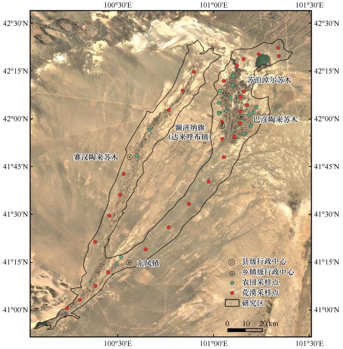 额济纳绿洲位于阿拉善高原西部,是阻挡风沙进入内陆并向东侵袭的第一道绿色屏障[1 ] 。该区域深居欧亚大陆腹地,年均降水量不足50 mm,蒸发量大于3 000 mm,极端干旱的气候条件导致土壤盐碱化与荒漠化问题交织并存。在全球气候变暖背景下,额济纳绿洲两河沿岸和东、西居延海一带的土壤盐碱化发展迅速[2 ] ,盐碱化程度不断加剧,进一步加剧了额济纳绿洲的萎缩,严重威胁着区域的生态安全。深入探究额济纳绿洲盐碱土的分布特征及基本组成,不仅对额济纳绿洲生态环境综合防治意义重大,也对干旱区生态屏障建设具有重要的指导作用。