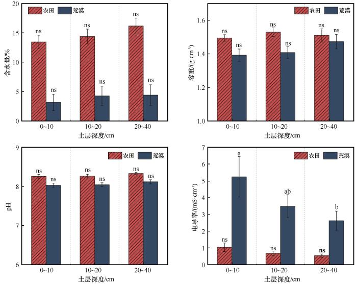 在土壤剖面尺度上,荒漠土壤平均含水量随着土层深度的增加有逐渐增大的趋势(图3 ),平均电导率有逐渐减小的趋势,但含水量、容重、pH值在3个土层深度间的差异均不显著,电导率仅在0~10 cm与20~40 cm土层间存在显著差异,表明土壤盐分存在显著的表聚现象。在农田景观中,理化指标随土壤深度的变化趋势基本与荒漠一致,但每个理化指标在深度上均无显著差异。