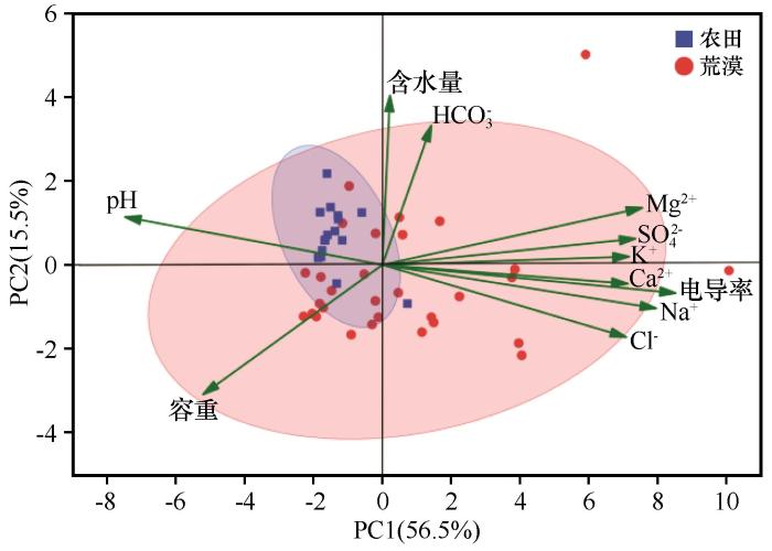 土壤离子浓度和理化指标的主坐标分析结果直观印证了荒漠与农田土壤水盐分布的差异性(图7 )。PC1轴(56.5%)解释了数据中绝大部分的变异。K⁺、Na⁺、Ca2+ 、Mg2+ 、SO4 2 - 、Cl⁻及电导率在PC1正方向上具有较高载荷,表明PC1主要反映了干旱区土壤盐分积累与电解质富集的过程。这些离子共同构成了可溶性盐分的主体,其在PC1正方向上的集中载荷说明该方向代表了土壤盐分含量高、矿化度强的特征。相反,土壤pH和容重在PC1负方向上贡献较大,可能与低盐分环境下离子强度较低及阳离子交换特征的变化有关。在盐分浓度较低时,土壤溶液中强离子间的电荷屏蔽作用减弱,部分碱性阳离子(如Na⁺)比例相对上升,可能导致土壤溶液呈弱碱性。同时,电解质浓度降低削弱了颗粒间的絮凝作用,土壤团聚体稳定性相对较弱,结构可能更为紧实,从而表现为容重偏高。综上,PC1主要反映了土壤盐分累积与电解质含量差异的综合特征。土壤含水量和HCO3 - 在PC2的正方向上具有较高载荷,HCO3 - 是灌溉水和地下水中的常见离子,其迁移性极强。较高的含水量和HCO3 - 浓度共同指向了水分的下行淋溶过程。这说明PC2主要代表土壤水分条件及相关碳酸盐离子的差异。据此可以看出,农田样本间的土壤水盐差异总体较小,主要分布在PC1的负方向和PC2的正方向上,受含水量、HCO3 - 、pH的驱动。荒漠景观样本间分布范围较广,各个样本间的土壤水盐差异较大,几乎受到所有盐分离子及含水量、容重的影响。