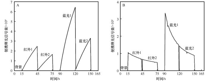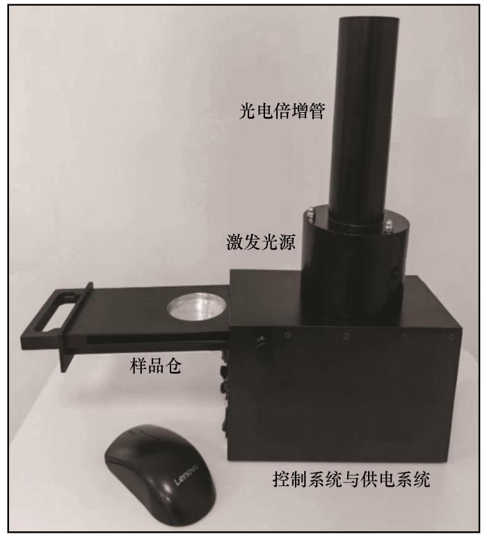 2 研究方法2.1 便携式释光仪与测试程序便携式释光仪由苏格兰大学环境研究中心(SUERC)开发[13],仪器主要由激发光源、光电倍增管、样品仓、控制系统、供电系统和程序软件等组成(图1).激发光源位于仪器中部,由880 nm红外LED和470 nm蓝色LED组成.光电倍增管置于仪器顶部,用于检测沉积物被激发出的释光信号强度.样品仓位于激发光源下部,可放置样品盒用于释光信号测试.仪器可使用220 V交流电源或内置5 V直流电源(电池)供电.此外,软件程序中可以设置激发光源类型、顺序和激发时间等. ...