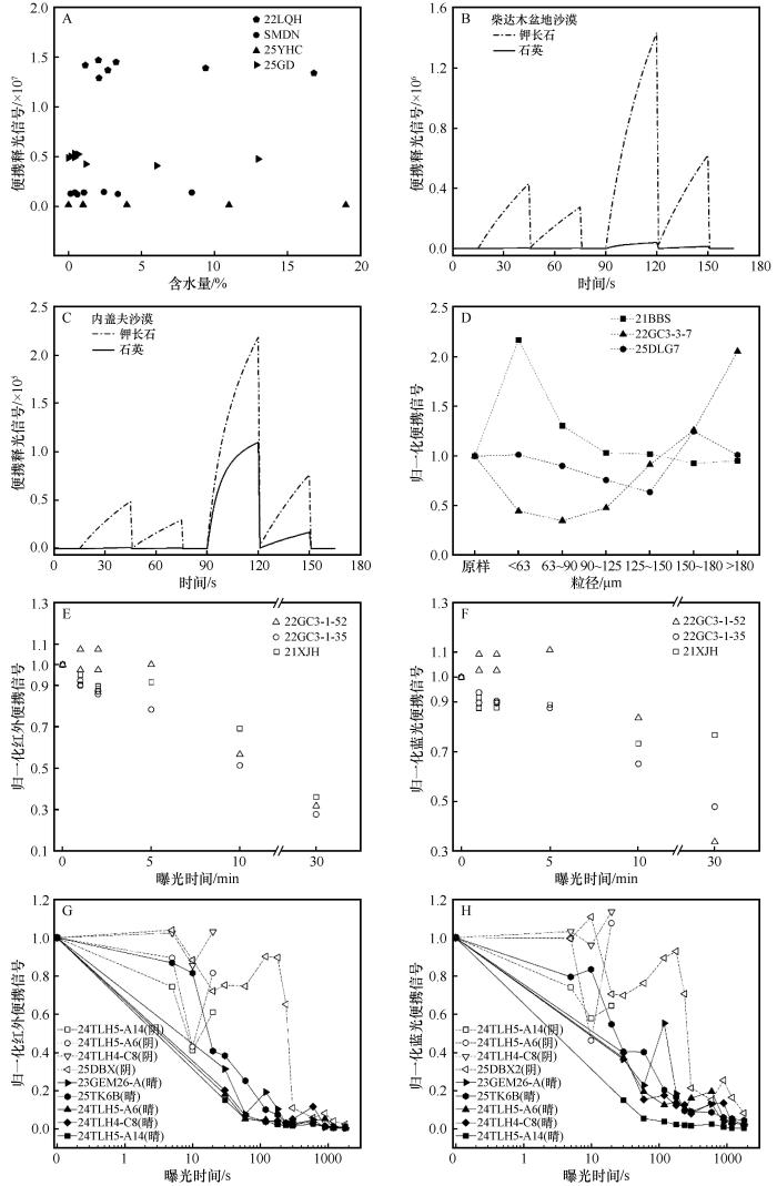 ... 在实际野外工作中,严格控制样品曝光时间是首要原则,因为光照会激发并释放沉积物晶体陷阱中的电子,导致释光信号衰减[1],影响测试结果的准确性.虽然短时间曝光对POSL信号影响较小,但为获取最具代表性的沉积物原生信号,仍需采取严格的避光操作.根据野外实践经验,采样时可使用不锈钢管并搭配遮光锡纸袋;制样与测试时选择非太阳直射的车内或较暗的室内环境进行,并控制样品曝光时间.在对长剖面进行系统采样前,可以进行间隔式POSL测试,若剖面信号差异较小,可能代表剖面年代相近,从而可以适当减少采样数量,提高年代学研究效率.总之,通过上述简便且“标准化”的操作流程,POSL能够最大程度地发挥其在野外工作中快速获取沉积物相对年代信息的独特优势,为研究区域剖面地层划分与年代框架构建提供高效可靠的支持. ...