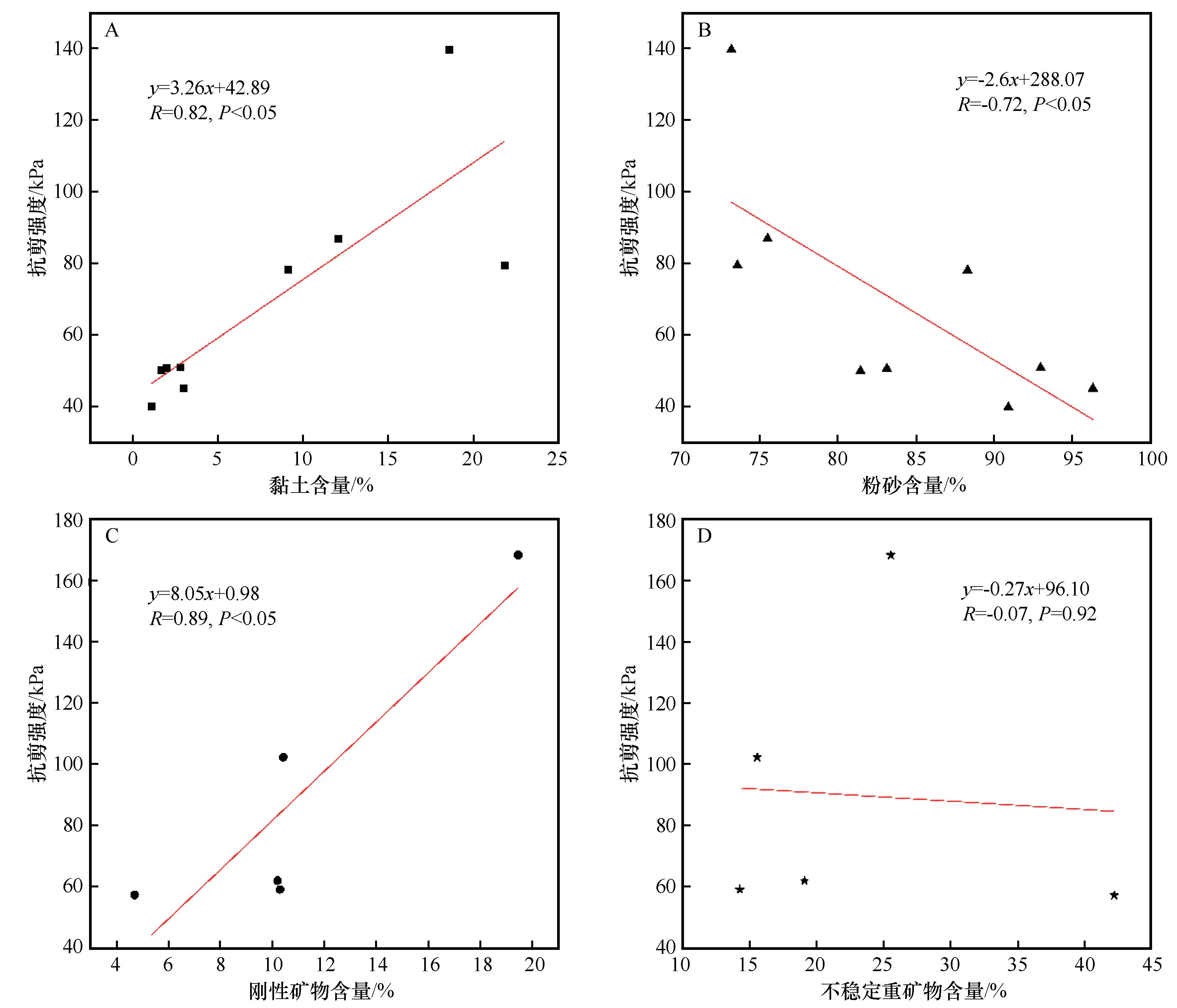 | 图5 泥漠黏土(A)、粉砂(B)、刚性矿物(C)及不稳定矿物(D)含量与抗剪强度相关性(粒度组分数据来自塔河流域) |