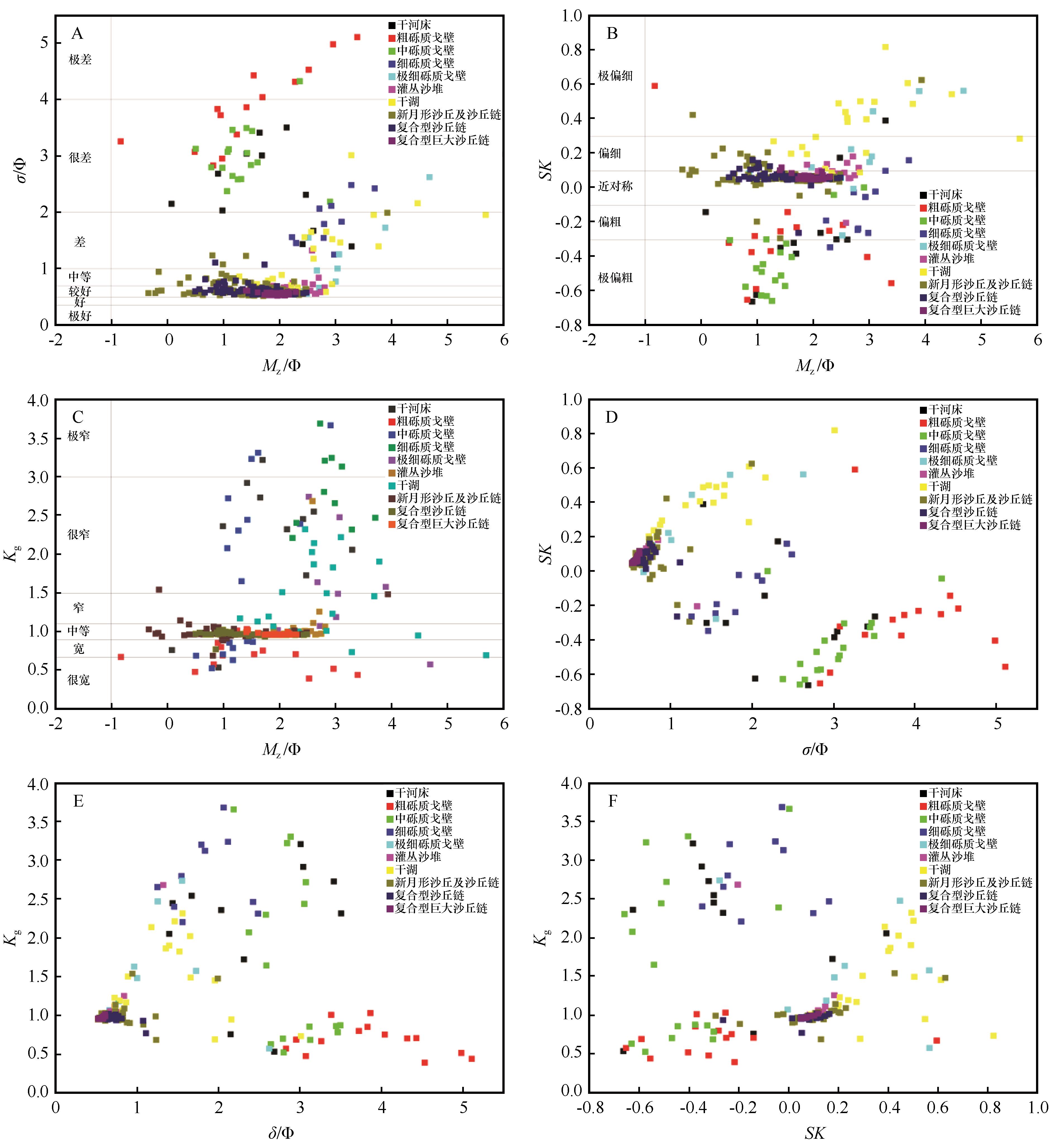 | Fig.3 Relationships between grain-size parameters of surface sediments in different geomorphological types |