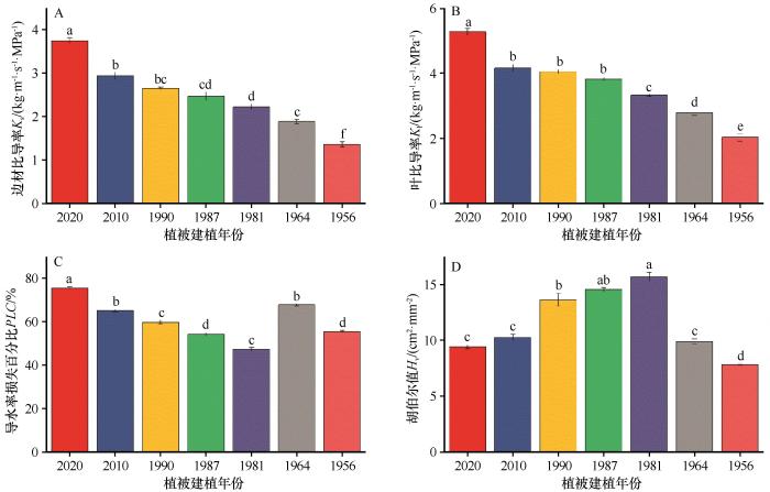 ... 胡伯尔值(Hᵥ)的单峰分布(图1D)揭示了柠条通过调整水力架构来优化水分利用的策略.这种结构调整具有多重效应:首先,能够补偿导管效率的下降,维持叶片水分供应;其次,提供水分储存缓冲,增强应对短期水分亏缺的能力;第三,增加水力安全边际,降低失控栓塞风险[37].在水分充足条件下,高Hᵥ可能造成过度投资,降低生长效率;而在干旱条件下其提供了关键的生存优势.本研究区年降水量仅186 mm,极端干旱事件频发,在这种环境下,结构补偿的收益可能大于成本.此外,补偿能力随演替阶段变化:前期植株资源有限,难以承担高补偿成本;后期植株生理功能衰退,补偿效果有限;只有中期植株在资源可用性和生理活力之间达到最佳平衡,能够实现有效补偿.演替后期Hᵥ的急剧下降表明补偿策略的不可持续性,这就使得植株既失去了高效的水分传输能力,又无法通过结构调整缓解水力限制,导致水力功能的全面崩溃.这也解释了许多人工灌木林在达到一定年龄后出现大面积衰退和死亡的现象[23]. ...