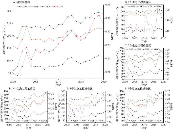 Interannual trends of vegetation productivity in the study area as a whole (A) and regions with ecological projects overlaps ranging from 1 to 5 (B-F)