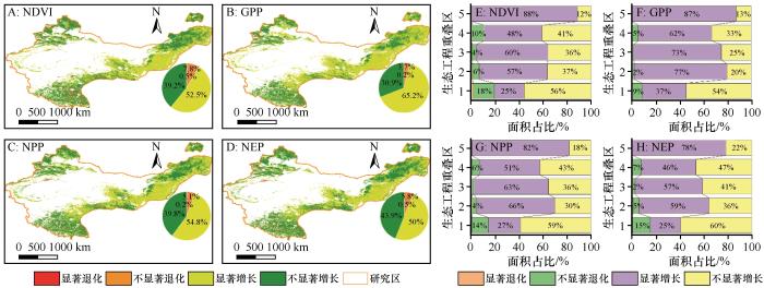 研究区植被生产力的空间变化具有异质性,但总体呈现明显提升趋势(图3),各指标数值增加的面积均超过研究区总面积的90%。具体而言,NDVI增加区域面积占研究区面积的91.7%,其中显著增加区域面积占比超过50%,退化区域面积不足10%(图3A);GPP增加的区域面积约为96.1%,其中显著增加的面积约为不显著增加面积的两倍以上(图3B);NPP增加的面积约为94.6%,显著增加区域占比超过50%(图3C);NEP表现为碳汇的面积约占93.9%,其中显著增加面积占50%(图3D)。各生态工程重叠区植被生产力的变化趋势占比不同,但同样以显著/不显著增长为主(图3E~H)。在生态工程重叠区,植被生产力以显著增长为主,其面积占各生态工程重叠区的45%以上,而在单一生态工程实施区,各植被生产力指数以不显著增长为主,均占一个生态工程实施面积的50%以上。