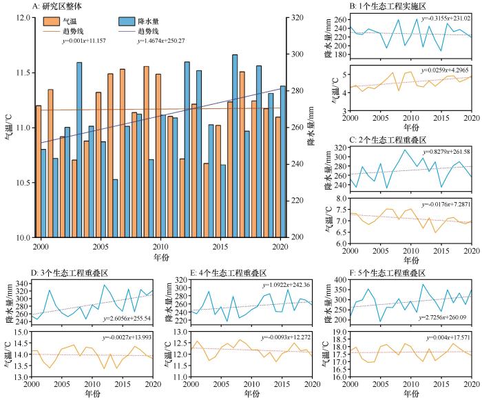 Interannual trends of climatic factors in the study area as a whole (A) and areas with 1-5 overlapping ecological projects (B-F)