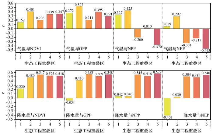 从各生态工程重叠区的植被生产力与气候因子的偏相关分析结果来看,各生态工程重叠区的植被生产力与气温和降水量的相关性存在显著差异,整体上植被生产力与降水量的相关度高于气温(图6)。就气温而言,各生态工程重叠区植被生产力与气温的相关性为-0.463~0.527。其中,除NPP,NEP在3~5个生态工程重叠区与气温呈负相关以外,其余均与气温呈正相关,且均在2个生态工程重叠区相关性最高。就降水量而言,各生态工程重叠区植被生产力与降水量的相关性为-0.403~0.558。其中,除GPP与NEP在1个生态工程实施区与降水量呈负相关以外,其余均与降水量呈正相关,且3~5个生态工程重叠区的相关性与气温相比较高。