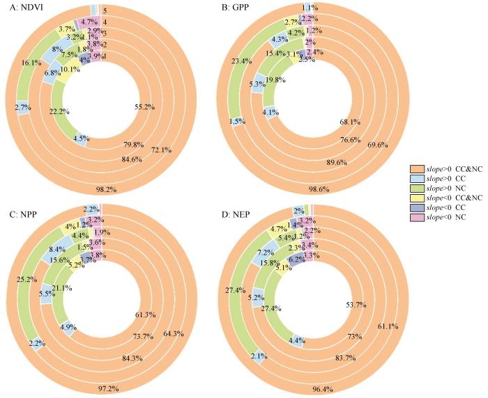 气候因素(CC)和非气候因素(NC)对植被生产力的影响在空间上表现不同。图7揭示了在各生态工程重叠区中,驱动力对各植被生产力变化影响的占比。气候-非气候因素共同作用对各植被生产力的提升起到首要作用;而使植被生产力降低的驱动力,以气候-非气候因素共同作用和非气候因素单独作用为主。值得注意的是,对比不同数量的生态工程叠加实施区来说,气候-非气候因素共同作用和非气候因素单独作用导致的植被生产力增加面积占各生态工程重叠区面积的80%以上,且生态工程叠加实施数量越多,这一比重越大。