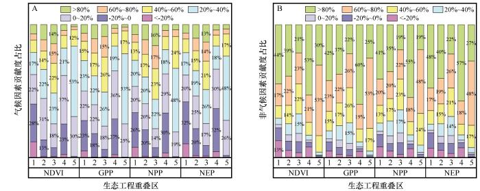 各个生态工程重叠区气候因素和非气候因素对植被生产力变化贡献度的占比