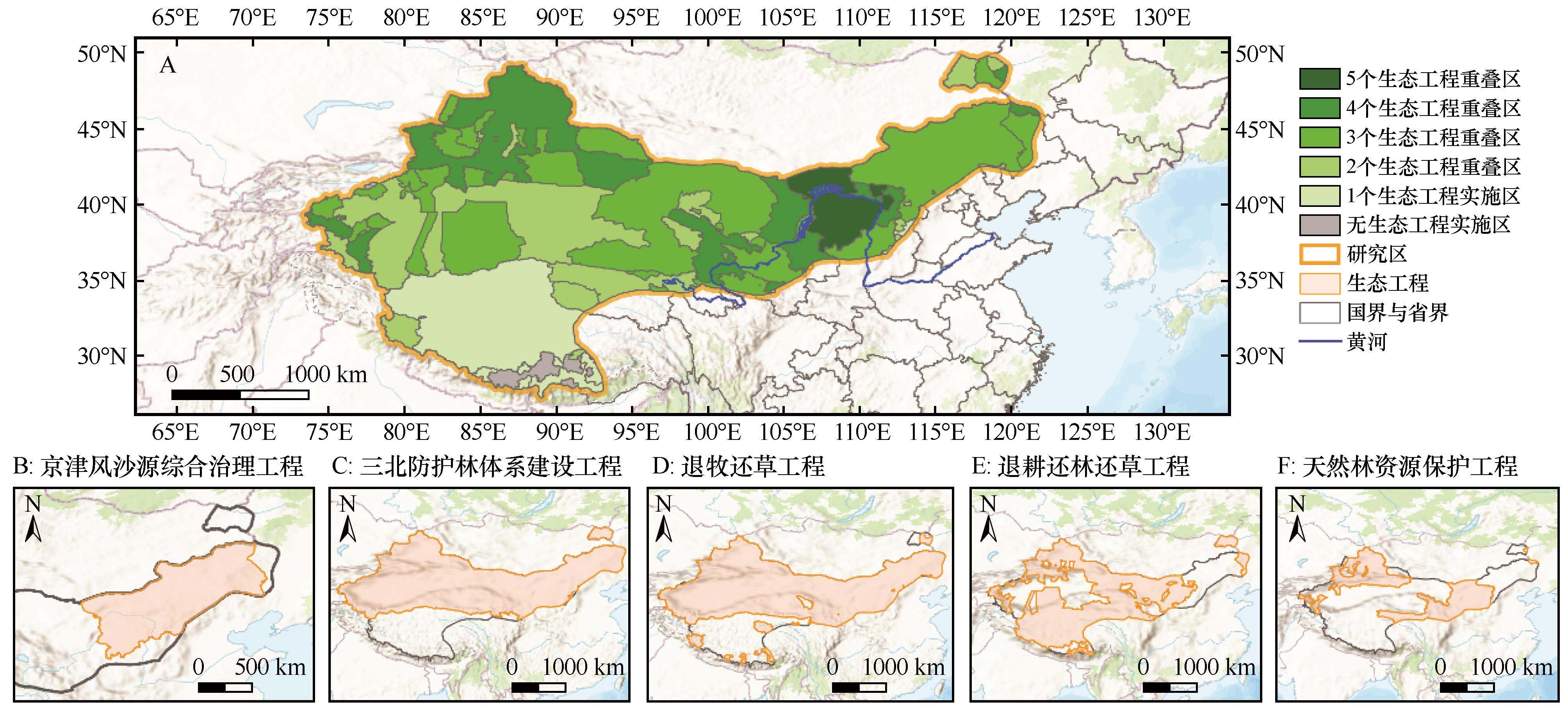 | Fig.1 Spatial distribution of overlapping ecological project areas in the study area |