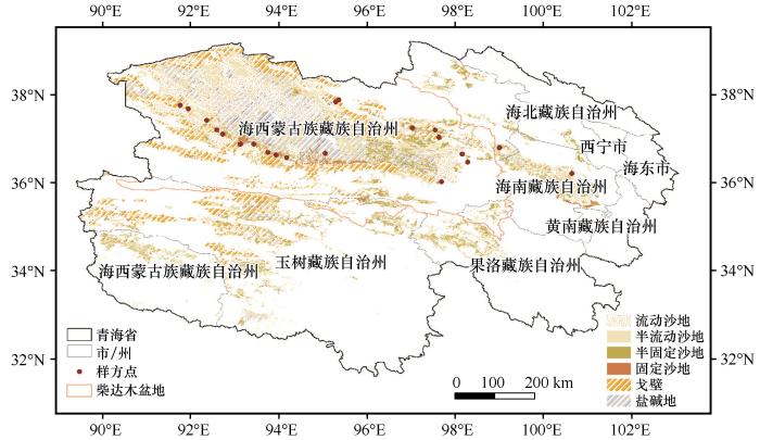 ... 青海省是中国沙化土地面积广、类型多样且具有代表性的省区[21].青海省沙区主要分布于青海省西北部和中部(图1).青海省沙化土地面积达12.4万km2,占全省总面积的17.7%;该地区沙化类型多样,涵盖沙丘、沙漠化草地和耕地,受干旱、强风和高海拔等自然条件影响,治理难度极大[22];过度放牧和耕作等人为活动进一步加剧了沙化进程,增加了生态恢复的难度[23].沙区地势西高东低、南北高中部低,地形复杂,地貌多样,沙区西北部为柴达木盆地,西南部为青南高原,东部处于青藏高原向黄土高原过渡带,沙区海拔2 573~5 368 m.2000—2024年,沙区年平均气温为-11.1~6.7 ℃,多年平均降水量小于350 mm,年平均风速为0.6~4.5 m·s-1,盛行西北风.流经沙区的河流主要有柴达木河、格尔木河、通天河等[24-25].沙区主要植物物种有芦苇(Phragmites australis)、冰草(Agropyron cristatum)、白刺(Nitraria tangutorum)、柽柳(Tamarix chinensis)等(表1). ...